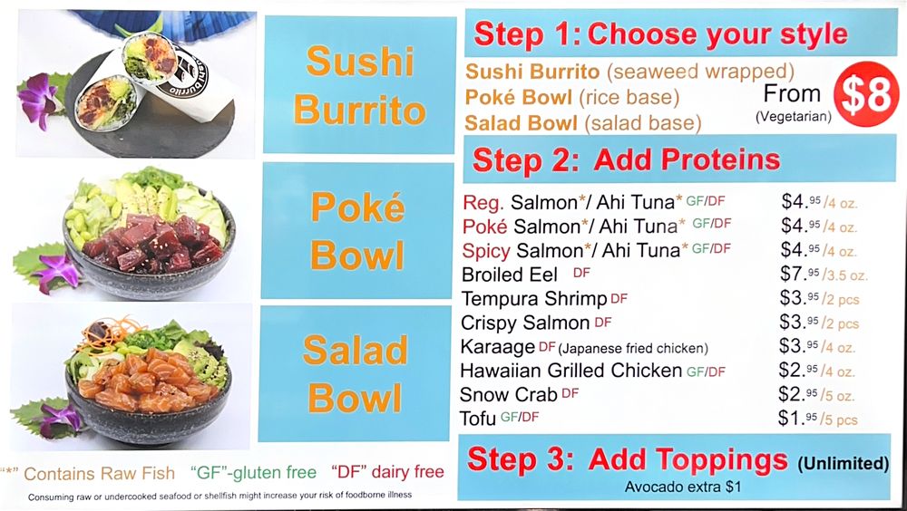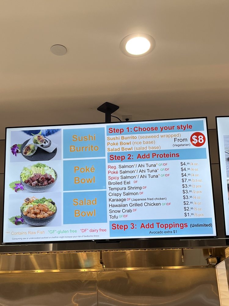 - Signature Burritos: Highlights include the Evergreen Burrito with spicy ahi tuna and crispy onions, and the indulgent Dragon Ball Burrito featuring broiled eel and shrimp tempura.
